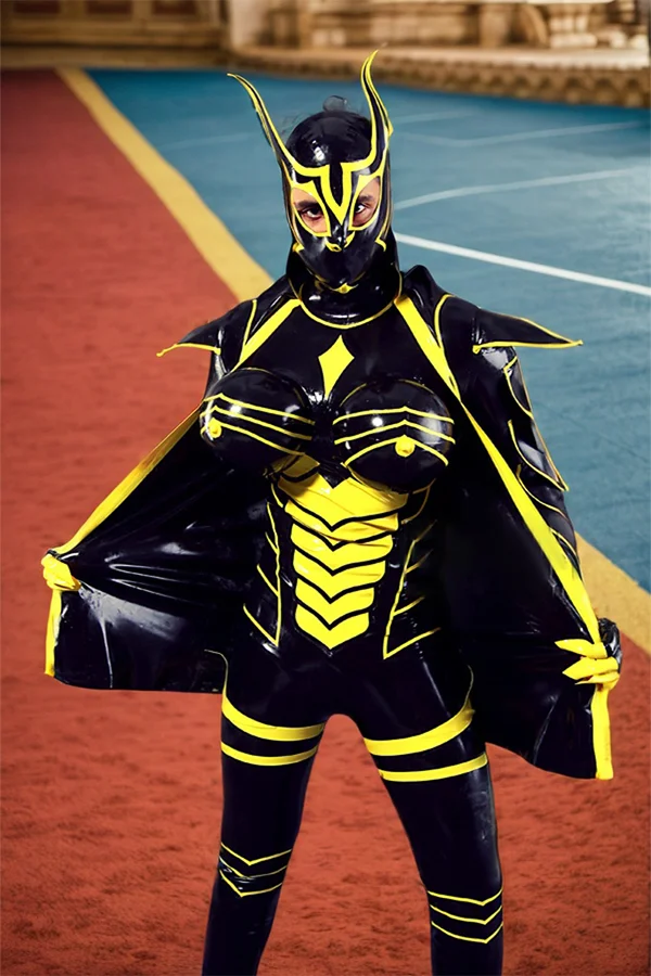 This black and yellow latex costume, with its high-gloss finish, intricate mask, bold patterned detailing, and dramatic wing-like cape, creates a complex, futuristic, and uniquely eye-catching ensemble.