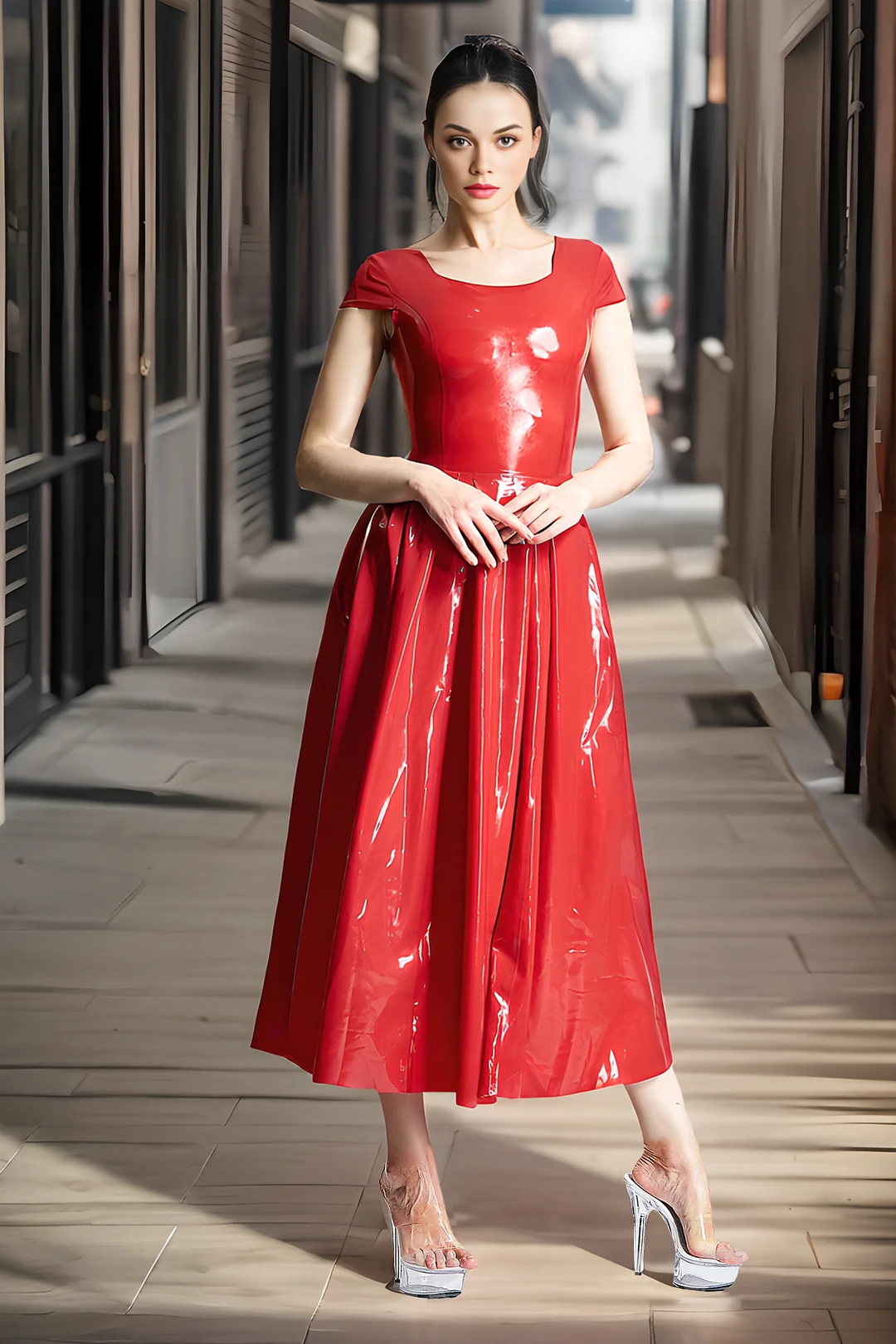 U-Neck & Flared Skirt Elegant Red Latex Midi Dress